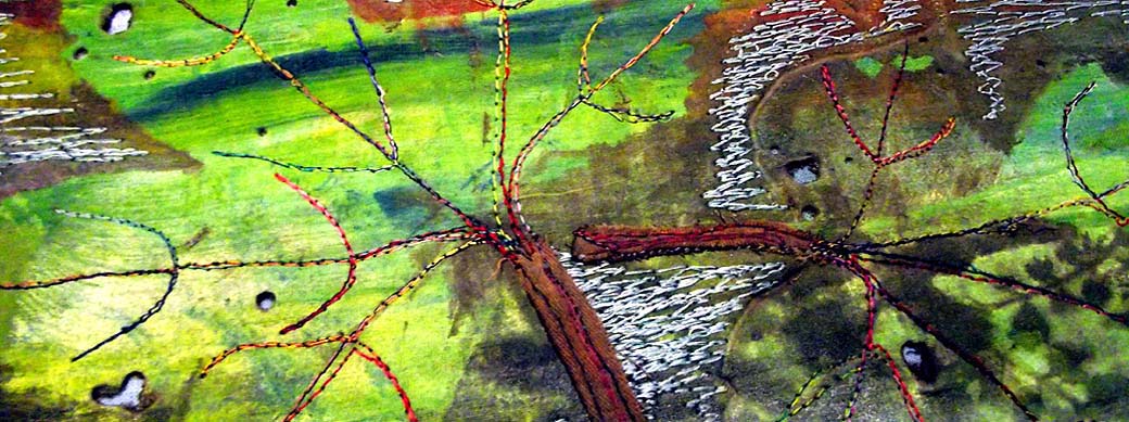 This collection was started for an exhibition of work at the Macphail Centre, Ullapool, in December 2014 and entitled "The Spirit of Trees". The theme was inspired by the work of David Young, who lives a few miles inland of Ullapool. He makes beautiful organic furniture out of the ancient and windblown trees from the garden of his house, which is the old manse of Clachan, Lochbroom. The contrast between the textures of the embroideries and the grain and polish of the wood made for a lovely, balanced, exhibition and we both sold many pieces.